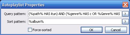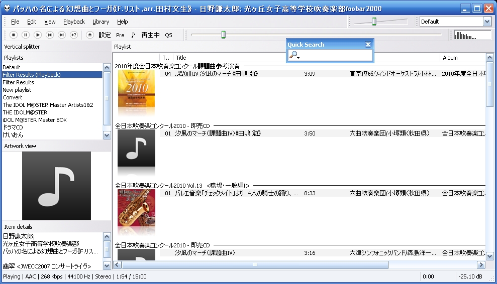 Vs.foobar2000 5回戦 PC全般 foobar2000 2012年03月27日 今回はiTunesでいうところのスマートプレイリストをfoobar2000で再現します。 勝手さえわかればiTunes以上に容易く扱うこともできます。 こちらがauto playlist の設定画面上のボックスの中がプレイリストを生成する設定です。 この中には一定の特殊な文法を用いるので、今回はその説明がメインになります。 つづきはこちら http:// [4回]PR