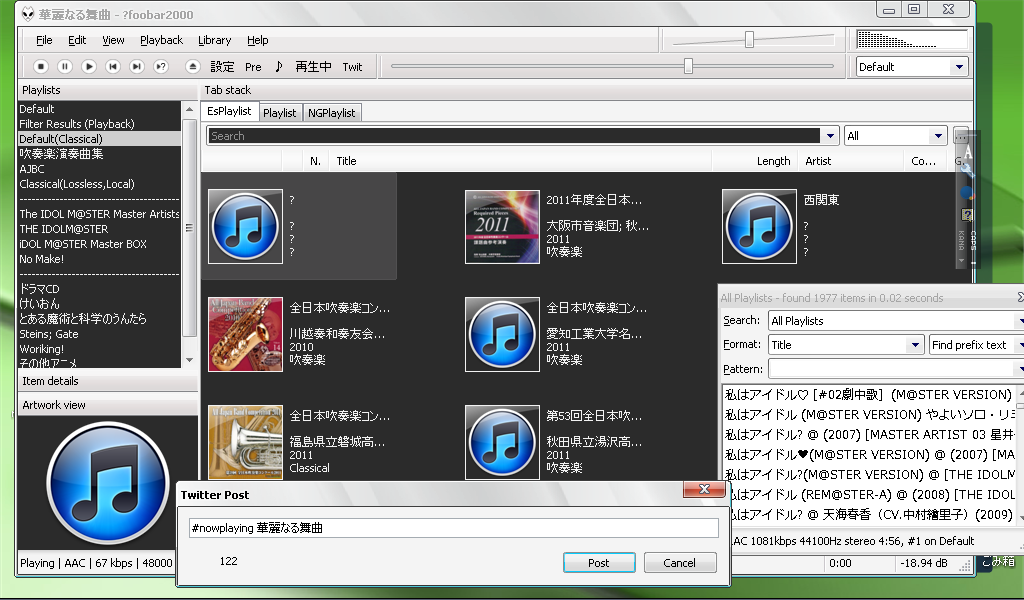 VS. foobar2k 一回戦 PC全般 foobar2000 2011年12月14日 こんにちは。どうもアレですね、やりたいことってのは増えていくもんで… けいおん!の映画の感想もさっさと書きたいし、アイマスCDレビューも続けたいんですけどここにきていじりたおしたfooobar2k がようやく思い通りになってくるというw ちなみにまだまだこんな感じ。 とりあえず高い壁だったのは「NG Playlist」に気づけなかったというwww iTunesっぽいUIを目指したんですがとりあえずは満足かなぁ。 つづきはこちら http:// [1回]